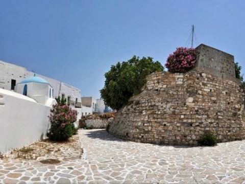 Υπό τον διαρκή κίνδυνο των πειρατικών επιδρομών, σε πολλά νησιά των Κυκλάδων η αρχιτεκτονική πήρε χαρακτήρα αμυντικό. Οι οικισμοί χτίζονταν σε φυσικές οχυρές θέσεις ή γύρω από κάποιο κάστρο, ή ολόκληρος ο οικισμός στριμωχνόταν μέσα στο στενό χώρο οχυρού περιβόλου. Βασικό ρόλο στις εξελίξεις έπαιξαν οι Βενετοί και οι Γενουάτες που κατέβαλαν συστηματική προσπάθεια για την αμυντική θωράκιση των κτήσεών τους, στο δεύτερο μισό του 15ου και στις αρχές του 16ου αιώνα.