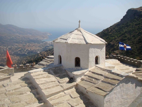 Η βυζαντινή μονή βρίσκεται στη θέση "Καταφύγιο", στη βόρεια πλαγιά του όρους Γερακώνες σε ύψος 230μ., και απολαμβάνει μοναδική θέα προς τα χωριά της κεντρικής Άνδρου στην κοιλάδα της Μεσαριάς έως και τη θάλασσα. Σύμφωνα με τον κώδικα της Μονής, το μοναστήρι κτίστηκες από τον βυζαντινό αυτοκράτορα Νικηφόρο Φωκά το 963-969μ.Χ.. Το καθολικό της μονής είναι ναός σταυροειδής με τρούλο και είναι αφιερωμένο στην Κοίμηση της Θεοτόκου. Στη Μονή φυλάσσεται η θαυματουργή εικόνα της Παναχράντου, έργο του Ευαγγελιστή Λουκά, καθώς και η Κάρα του Αγίου Παντελεήμονος. Η Μονή διαθέτει επίσης βιβλιοθήκη με σημαντική συλλογή από αρχαίους κώδικες και πατριαρχικά σιγίλια.