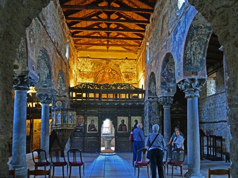 Το κτίσμα είναι Τρίκλιτη ξυλόστεγη βασιλική του 14ου αιώνα, αφιερωμένη στο Χριστό, Σοφία και Λόγο του Θεού. Ο βόρειος και ο νότιος τοίχος της εκκλησίας είναι επισκευασμένος στα μέσα του 17ου αιώνα, ενώ ο μεταγενέστερος νάρθηκας είναι κτίσμα της δεκαετίας του 1920. Τοιχογραφίες διατηρούνται στο ιερό βήμα, στις επιφάνειες επάνω από τις κιονοστοιχίες, στα εσωρράχια των τόξων και τους πεσσούς. Οι παλαιότερες τοιχογραφίες χρονολογούνται γύρω στα 1380. Αξιόλογο είναι το ξυλόγλυπτο τέμπλο του ναού, των μέσων του 18ου αιώνα, με εικόνες του ζωγράφου Αποστόλη Λογγιανού Βοδενιότη (1761).