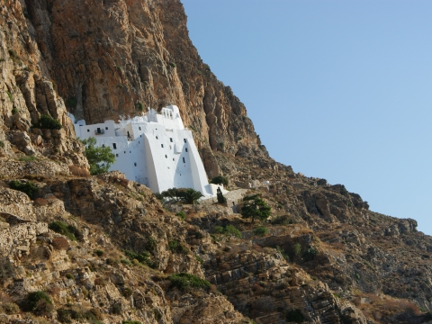 Το πιο διάσημο αξιοθέατο της Αμοργού βρίσκεται στην Νότια, απόκρημνη, αλίμενη ακτή του νησιού, φωλιασμένο μέσα σε αγκαθωτούς, απειλητικούς βράχους, είναι ορατό μόνον από το πέλαγος, που απλώνεται απέραντο κάτω από τα βράχια, 300μ. υψηλά. Η κάτασπρη, απέριττη όψη του εναρμονίζεται θαυμαστά με τα πολύχρωμα ανώμαλα βράχια. Μόνον από κοντά διαγράφονται οι λευκοί γεωμετρικοί όγκοι και τα αυστηρά γραμμικά περιγράμματα του κτιρίου που, με την συνεργεία του φωτός, δημιουργούν την αίσθηση πολυεπίπεδης επιφάνειας.