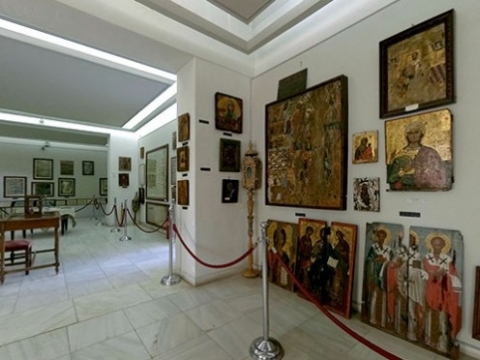 Το πλούσιο σκευοφυλάκιο του Ιδρύματος περιλαμβάνει μέρος μόνο των αφιερωμάτων, κυρίως έργα εκκλησιαστικής αργυροχοΐας και χρυσοκεντητικής, εκτεθειμένα σε κομψές προθήκες. Άξια ιδιαίτερης προσοχής είναι: