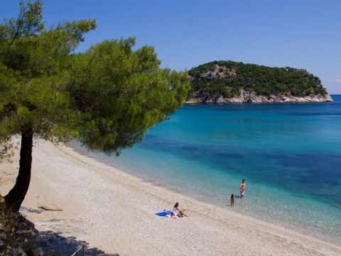Αμμώδης παραλία με καθαρά νερά στην καρδιά ενός πευκόφυτο κόλπου στα νότια του νησιού. Απέχει 4.5 χλμ από την Χώρα της Σκοπέλου και είναι οργανωμένη με ομπρέλες, ξαπλώστρες, beach bar και ναυαγοσώστη.