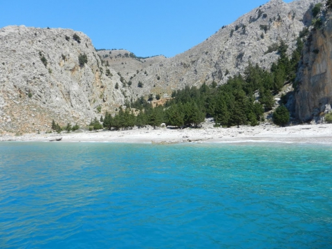 Από τις ωραιότερες παραλίες με βότσαλο μέσα σε ένα μεγάλο και βαθύ όρμο πλαισιωμένο από βουνά με αραιά αγριοκυπάρισσα.