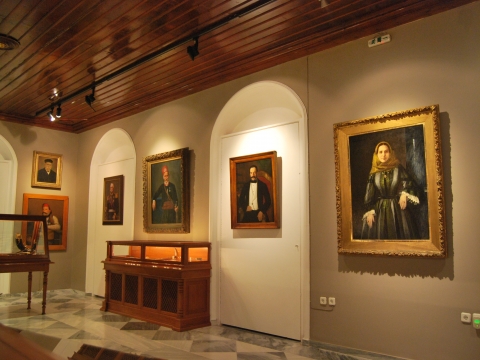 3. προσωπογραφίες, ελαιογραφίες οι περισσότερες, ιστορικών μορφών όπως του Εμμανουήλ Τομπάζη, του Ανδρέα Μιαούλη και της Ελένης Κριέζη.