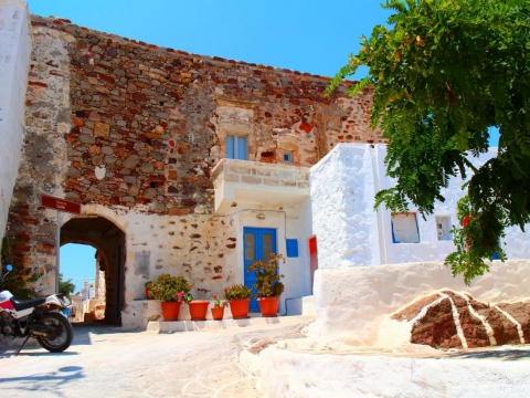 Το Μέσα Κάστρο είναι σήμερα ερειπωμένο. Το Έξω Κάστρο αποτελείται από μια σειρά σπιτιών, ο εξωτερικός τοίχος των οποίων αποτελούσε ταυτόχρονα και το τείχος, του αμυντικού στη λειτουργία του, κάστρου. Σε πολλά σπίτια υπάρχουν υπέρθυρα με οικόσημα και χρονολογίες. Ανάμεσα στις δυο σειρές σπιτιών υπήρχε δρόμος περιμετρικός, στενός τόσο που να χωράει μόνο μικρά κάρα. Το Έξω Κάστρο έχει δυο πύλες: την Κάτω Πόρτα στα νότια, στο δρόμο της Αγοράς και την Πάνω Πόρτα στην ανατολική πλευρά, δίπλα στην οποία βρίσκεται σήμερα το Λαογραφικό και Ναυτικό Μουσείο. Οι πύλες φέρουν χρονολογίες οι οποίες αφορούν επισκευή τους (1650 και 1646 αντίστοιχα), μετά από πειρατική επίθεση το 1638, οπότε το Κάστρο πυρπολήθηκε. Τότε ενισχύθηκε το Κάστρο με περισσότερους πύργους. Σήμερα στα σπίτια της εξωτερικής σειράς έχουν ανοιχτεί πόρτες και παράθυρα προς τα έξω. Στο Μέσα Κάστρο υπάρχουν 2 είσοδοι.