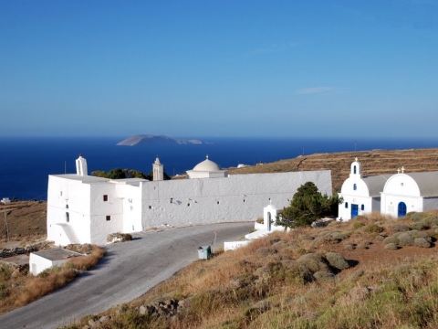 Η εκκλησία που στέκει στο κέντρο του περίβολου, είναι αφιερωμένη στους Αρχάγγελους Γαβριήλ και Μιχαήλ και περιστοιχίζεται από κελιά. Σύμφωνα με τον Κώδικά της η μονή ιδρύθηκε το 1570-72 και από την αρχή διαχειρίστηκε τα κτήματα των Ενετών ηγεμόνων του νησιού και την περιουσία της μονής της Παναγίας. Στην Τουρκοκρατία έφτασε να αριθμεί 100 μοναχούς. Σήμερα διατηρούνται αξιόλογα κειμήλια, το χρυσοποίκιλτο τέμπλο, καθώς και η βιβλιοθήκη του 1909. Από τις τοιχογραφίες του ναού ελάχιστες έχουν διασωθεί.