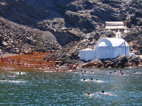 Καθημερινά πραγματοποιούνται εκδρομές με καΐκια στο ηφαίστειο, μια εκδρομή που συνδυάζει επίσης τις θερμές πηγές και πολλές φορές τη Θηρασιά. Τα καραβάκια που κάνουν εκδρομές στο ηφαίστεια ξεκινούν συνήθως από τον Γιαλό κάτω από τα Φηρά (παλιό λιμάνι), τον Αθηνιό (νέο λιμάνι) και το Αμμούδι, κάτω από την Οία. Θα πάτε πρώτα στη Νέα Καμένη όπου μπορείτε να περπατήσετε μέχρι τον κρατήρα του ηφαιστείου.