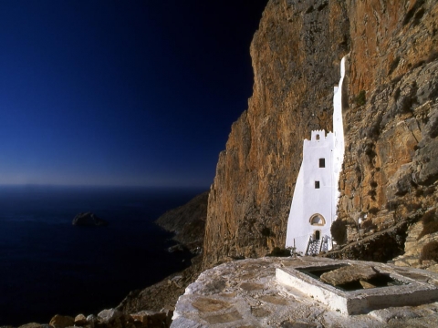 Το πιο διάσημο αξιοθέατο της Αμοργού βρίσκεται στην Νότια, απόκρημνη, αλίμενη ακτή του νησιού, φωλιασμένο μέσα σε αγκαθωτούς, απειλητικούς βράχους, είναι ορατό μόνον από το πέλαγος, που απλώνεται απέραντο κάτω από τα βράχια, 300μ. υψηλά. Η κάτασπρη, απέριττη όψη του εναρμονίζεται θαυμαστά με τα πολύχρωμα ανώμαλα βράχια. Μόνον από κοντά διαγράφονται οι λευκοί γεωμετρικοί όγκοι και τα αυστηρά γραμμικά περιγράμματα του κτιρίου που, με την συνεργεία του φωτός, δημιουργούν την αίσθηση πολυεπίπεδης επιφάνειας.