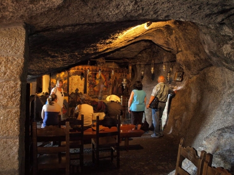 Βρίσκεται βόρεια του οικισμού της χώρας και λίγο χαμηλότερα από τη Μονή του Αγίου Ιωάννου του Θεολόγου, κοντά στη Πατμιάδα Σχολή. Το σπήλαιο αποτελεί τον λατρευτικό πυρήνα ενός πολύπλοκου κτιριακού συγκροτήματος που είναι γνωστό ως Μονή της Αποκάλυψης. Σύμφωνα με την παράδοση, μέσα σε αυτό, ο Ευαγγελιστής Ιωάννης δέχτηκε την Αποκάλυψη και την υπαγόρευσε στο μαθητή του Πρόχορο. Στο ευρύχωρο άνοιγμα της σπηλιάς έχει διαμορφωθεί παρεκκλήσι του Αγίου Ιωάννου. Ο φυσικός βράχος σχηματίζει την οροφή και τις πλευρές του καθώς και την ανατολική πλευρά του ιερού βήματος στο οποίο έχουν λαξευθεί οι κόγχες της Πρόθεσης, του Διακονικού και η κεντρική κόγχη που χρησιμεύει ως Αγία Τράπεζα. Το Βήμα απομονώνεται από τον υπόλοιπο χώρο με ξύλινο τέμπλο κοσμημένο με σημαντικές μεταβυζαντινές εικόνες. Τα τοιχώματα του Βήματος και τις κόγχες κοσμούσαν κατά τους μεσοβυζαντινούς χρόνους τοιχογραφίες που χρονολογούνται στα τέλη του 12ου αιώνα .Κεντρικό εικονογραφικό θέμα αποτελεί η παράσταση του Αγ. Ιωάννου που υπαγορεύει στον Πρόχορο την Αποκάλυψη. Η αρχική διαμόρφωση του χώρου αποδίδεται σύμφωνα με την παράδοση στον όσιο Χριστόδουλο, κτήτορα της Μονής του Αγίου Ιωάννου.
