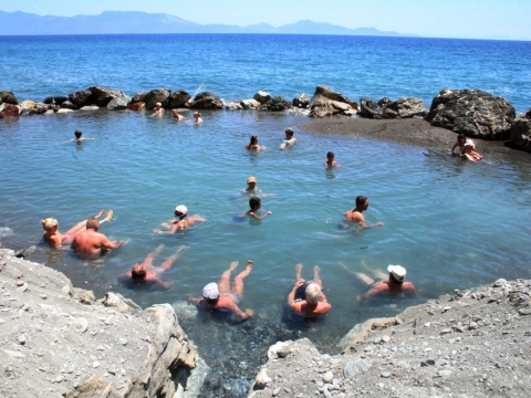 Η εμπειρία ανεκτίμητη, ένα φυσικό σπά! Στο μπροστινό μέρος της παραλίας έχει δημιουργηθεί μια μικρή λίμνη που διαχωρίζεται από την υπόλοιπη παραλία με βράχια που επιτρέπουν στο θαλασσινό νερό να εισέρχεται και να δροσίζει τα καυτά νερά. Η παραλία αυτή είναι κατάλληλη για όλες τις ηλικίες και για όλες τις εποχές. Μπορείτε να επισκεφθείτε τα Θερμά είτε με το λεωφορείο, είτε με οποιοδήποτε ιδιωτικό μεταφορικό μέσο.